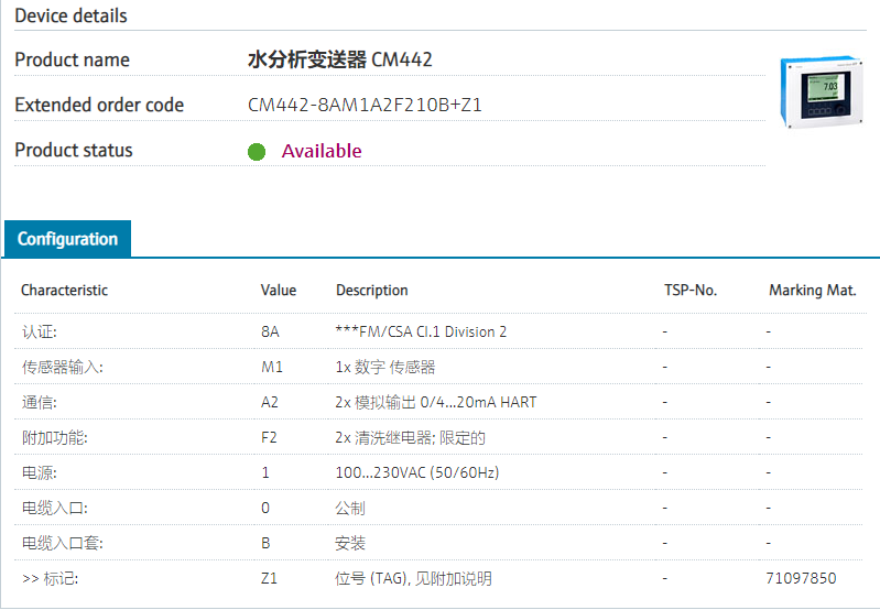 CM442-8AM1A2F210B 订货号 CM442--KP32/0 扩展订货号 (CM442-8AM1A2F210B) 名称 水分析变送器 CM442 基本描述 Transmitter liquid analysis