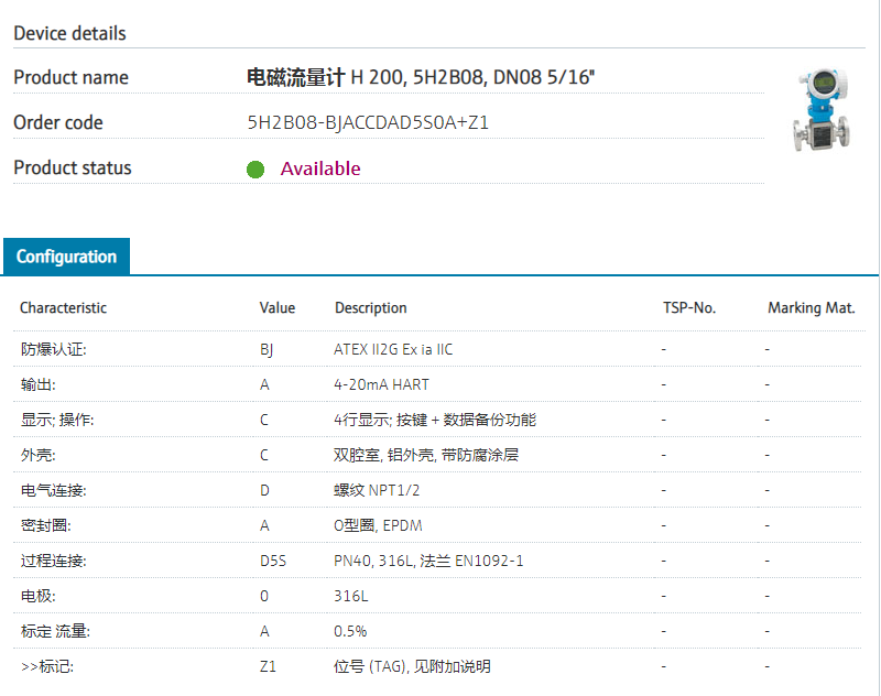5H2B08-BJACCDAD5S0A 订货号 5H2B08-4MU3/0 扩展订货号 (5H2B08-BJACCDAD5S0A) 名称 电磁流量计 H 200, 5H2B08, DN08 5/16" 防爆认证: BJ ATEX II2G Ex ia IIC 输出: A 4-20mA HART 显示; 操作: C 4行显示; 按键 + 数据备份功能 外壳: C 双腔室, 铝外壳, 带防腐涂层 电气连接: D 螺纹 NPT1/2 密封圈: A O型圈, EPDM 过程连接: D5S PN40, 316L, 法兰 EN1092-1 电极: 0 316L 标定 流量: A 0.5%