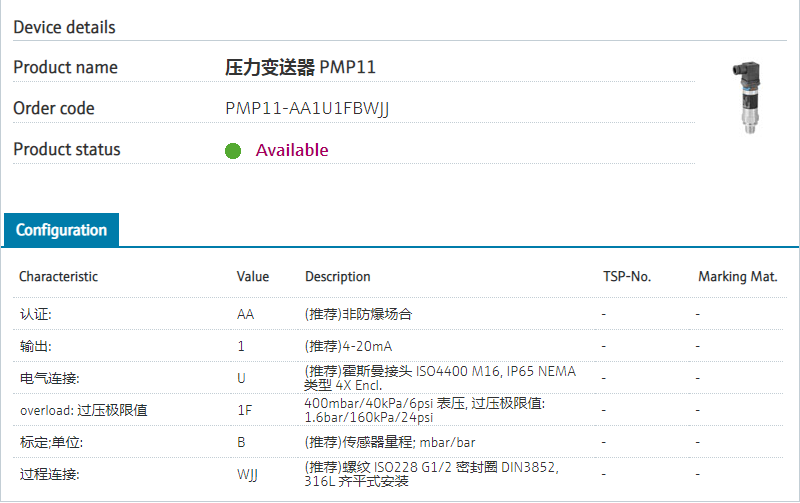 PMP11-AA1U1FBWJJ 订货号 PMP11-19T4/0 扩展订货号 (PMP11-AA1U1FBWJJ) 名称 压力变送器 PMP11 基本描述 压力, 压阻式