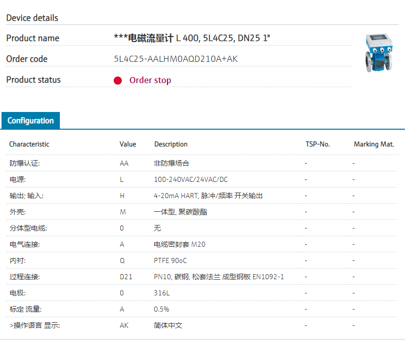 5L4C25-AALHM0AQD210A+AK 订货号 5L4C25-13F6/0 扩展订货号 (5L4C25-AALHM0AQD210A+AK) 名称 ***电磁流量计 L 400, 5L4C25, DN25 1" 基本描述 Electromagnetic flowmeter