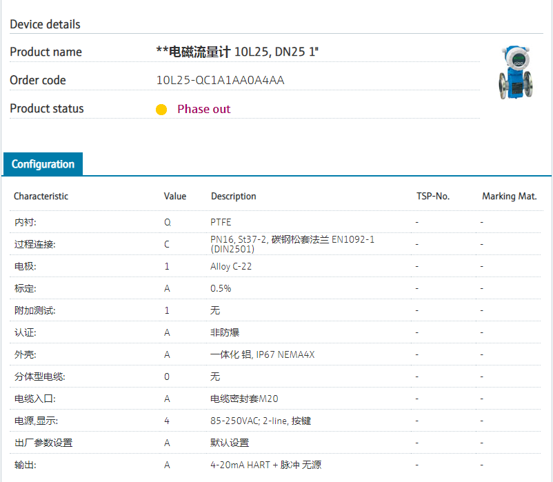 10L25-QC1A1AA0A4AA 订货号 10L25-13R1/10 扩展订货号 (10L25-QC1A1AA0A4AA) 名称 ***电磁流量计 10L25, DN25 1" 内衬: Q PTFE 过程连接: C PN16, St37-2, 碳钢松套法兰 EN1092-1 (DIN2501) 电极: 1 Alloy C-22 标定: A 0.5% 附加测试: 1 无 认证: A 非防爆 外壳: A 一体化 铝, IP67 NEMA4X 分体型电缆: 0 无 电缆入口: A 电缆密封套M20 电源,显示: 4 85-250VAC; 2-line, 按键 出厂参数设置 A 默认设置 输出: A 4-20mA HART + 脉冲 无源