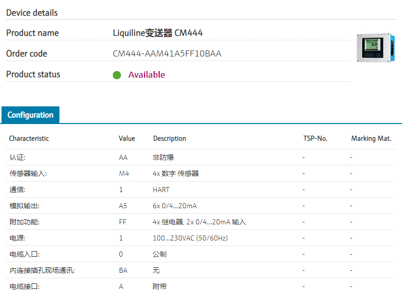 CM444-AAM41A5FF10BAA 订货号 CM444-2F65/0 扩展订货号 (CM444-AAM41A5FF10BAA) 名称 Liquiline变送器 CM444 基本描述 Transmitter liquid analysis