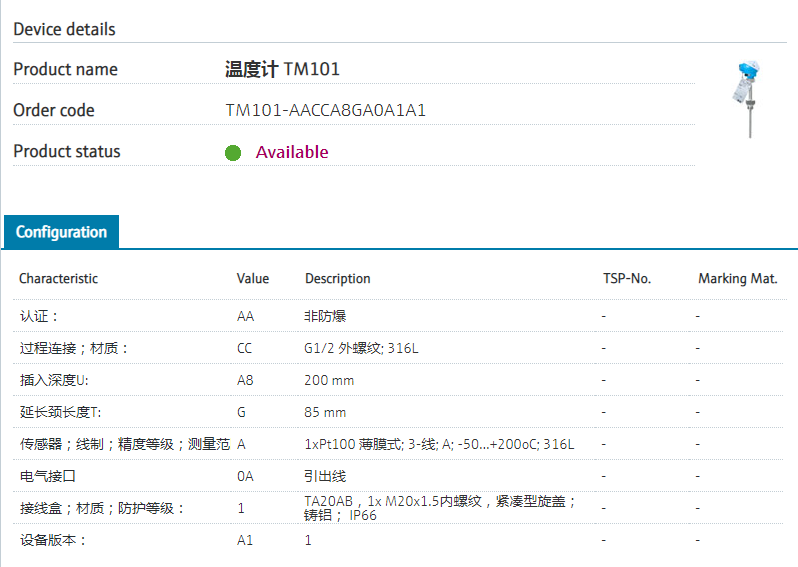 316L, Alloy600.认证: AA 非防爆 过程连接;材质: CC G1/2 外螺纹; 316L 插入深度U: A8 200 mm 延长颈长度T: G 85 mm 传感器;线制;精度等级;测量范围;材质: A 1xPt100 薄膜式; 3-线; A; -50...+200oC; 316L 电气接口 0A 引出线 接线盒;材质;防护等级: 1 TA20AB,1x M20x1.5内螺纹,紧凑型旋盖;铸铝; IP66 设备版本: A1 1