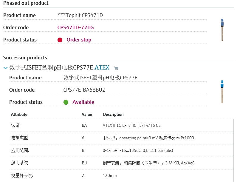 CPS11D-7BT21 0-14pH, 0-135℃, 16 bar; 离子捕捉阱,主要用于化工场合。防爆的型号为CPS11D-7BT2G, 已经进入退市阶段,新款是 CPS11E-AA7BTA2 | CPS11E-10K6/0