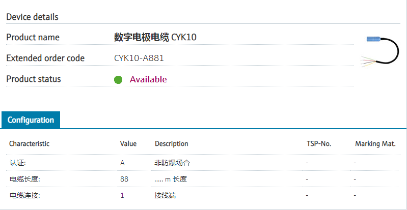 E+H数字电极电缆,适合所有带memosens接口的电极,支持PH/ORP, 电导率,溶解氧,浊度,余氯.....,阿仪常备大量5米,10米的现货,价格优惠,欢迎采购 CYK10-A031 电缆长度3米 CYK10-A051 电缆长度5米 CYK10-A101 电缆长度10米 CYK10-A151 电缆长度15米 CYK10-A201 电缆长度20米