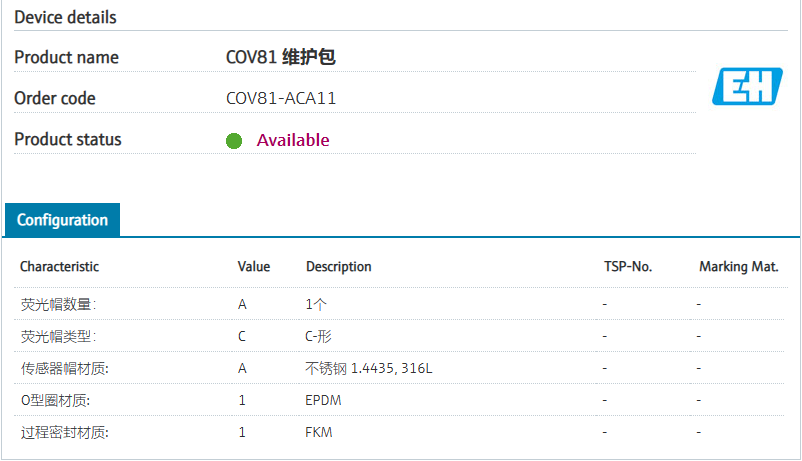 for maintenance of COS81D and COS81E荧光帽数量: A 1个 荧光帽类型: C C-形 传感器帽材质: A 不锈钢 1.4435, 316L O型圈材质: 1 EPDM 过程密封材质: 1 FKM