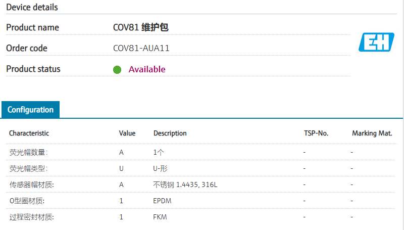 for maintenance of COS81D and COS81E荧光帽数量: A 1个 荧光帽类型: U U-形 传感器帽材质: A 不锈钢 1.4435, 316L O型圈材质: 1 EPDM 过程密封材质: 1 FKM
