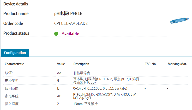 and environmental.认证: AA 非防爆场合 电极类型 5 基本型, 过程连接 NPT 3/4", 零点 pH 7,0, 温度传感器 NTC 30k 应用范围: L 0–14 pH, 0…110oC, 0,8…11 bar (abs) 参比系统 AD PTFE环状隔膜, 双腔室结构, 3 M KNO3, 3 M KCl, Ag/AgCl 插入深度: 2 13mm, 平头膜片