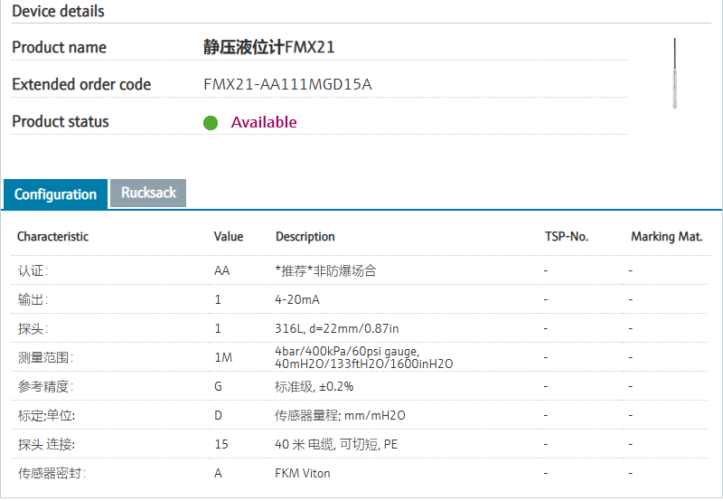 FMX21-AA111MGD15A 订货号 FMX21-1FH66/0 扩展订货号 (FMX21-AA111MGD15A) 名称 静压液位计FMX21 基本描述 Level measurement, Hydrostatic.