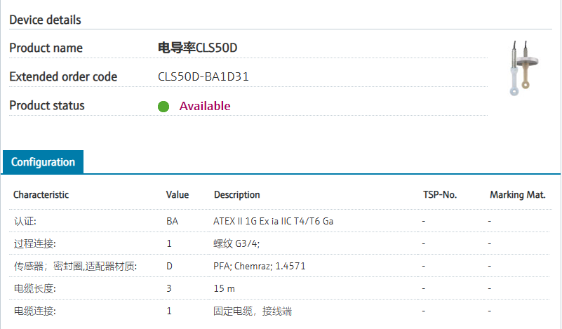 CLS50D-BA1D31 订货号 CLS50D-1NK4/0 扩展订货号 (CLS50D-BA1D31) 名称 电导率CLS50D 基本描述 Conductivity; inductive sensor