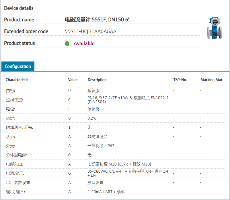 55S1F-UCJB1AA0AGAA 扩展订货号 55S1F-UCJB1AA0AGAA 名称 电磁流量计 55S1F, DN150 6" 内衬: U 聚氨脂 过程连接: C PN16, St37-2/FE 410W B, 碳钢法兰 EN1092-1 (DIN2501) 电极: J 碳化钨 标定: B 0.2% 附加测试, 证书: 1 无 认证: A 非防爆场合 外壳: A 一体化 铝, IP67 分体型电缆: 0 无 电缆入口: A 电缆密封套 M20 (EEx d > 螺纹 M20) 电源,显示: G 85-260VAC; CN, 4-行 + 光敏按键, CN= 语种 ZH + EN 出厂参数设置 A 默认设置 输出, 输入: A 4-20mA HART + 频率
