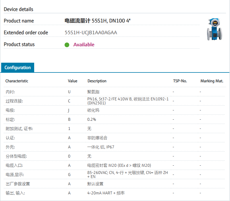55S1H-UCJB1AA0AGAA 扩展订货号 55S1H-UCJB1AA0AGAA 名称 电磁流量计 55S1H, DN100 4" 内衬: U 聚氨脂 过程连接: C PN16, St37-2/FE 410W B, 碳钢法兰 EN1092-1 (DIN2501) 电极: J 碳化钨 标定: B 0.2% 附加测试, 证书: 1 无 认证: A 非防爆场合 外壳: A 一体化 铝, IP67 分体型电缆: 0 无 电缆入口: A 电缆密封套 M20 (EEx d > 螺纹 M20) 电源,显示: G 85-260VAC; CN, 4-行 + 光敏按键, CN= 语种 ZH + EN 出厂参数设置 A 默认设置 输出, 输入: A 4-20mA HART + 频率
