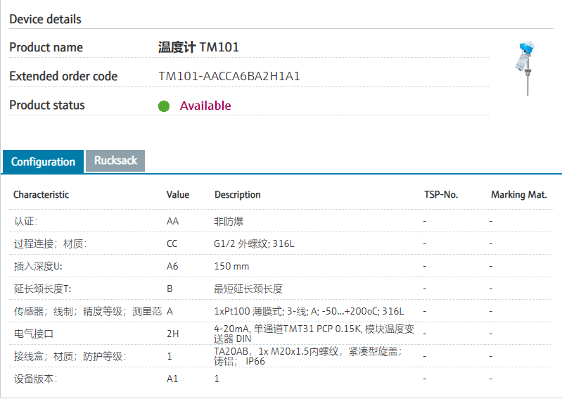 316L, Alloy600.认证: AA 非防爆 过程连接;材质: CC G1/2 外螺纹; 316L 插入深度U: A6 150 mm 延长颈长度T: B 最短延长颈长度 传感器;线制;精度等级;测量范围;材质: A 1xPt100 薄膜式; 3-线; A; -50...+200oC; 316L 电气接口 2H 4-20mA, 单通道TMT31 PCP 0.15K, 模块温度变送器 DIN 接线盒;材质;防护等级: 1 TA20AB,1x M20x1.5内螺纹,紧凑型旋盖;铸铝; IP66 设备版本: A1 1