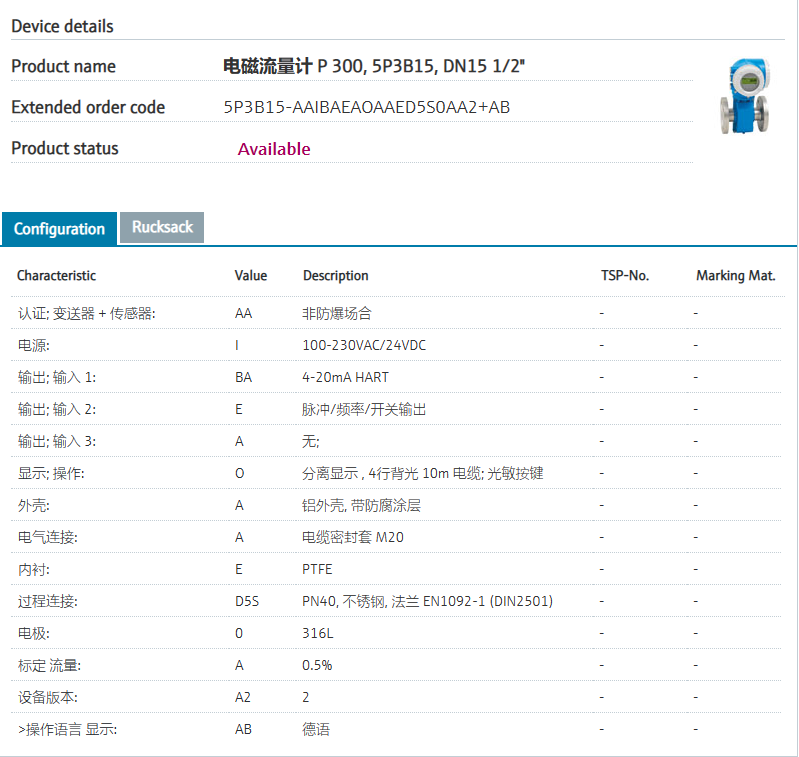 5P3B15-AAIBAEAOAAED5S0AA2AB 订货号 5P3B15-13761/0 扩展订货号 (5P3B15-AAIBAEAOAAED5S0AA2AB) 名称 电磁流量计 P 300,5P3B15, DN15 1/2" 基本描述 Electromagnetic flowmeter