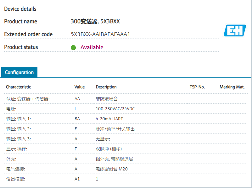 5X3BXX-AAIBAEAFAAA1 订货号 5X3BXX-10F9/0 扩展订货号 (5X3BXX-AAIBAEAFAAA1) 名称 300变送器, 5X3BXX 基本描述 With an integrated web server. 认证; 变送器 + 传感器: AA 非防爆场合 电源: I 100-230VAC/24VDC 输出; 输入 1: BA 4-20mA HART 输出; 输入 2: E 脉冲/频率/开关输出 输出; 输入 3: A 无显示; 显示; 操作: F 双脉冲 (相移) 外壳: A 铝外壳, 带防腐涂层 电气连接: A 电缆密封套 M20 设备模型: A1 1