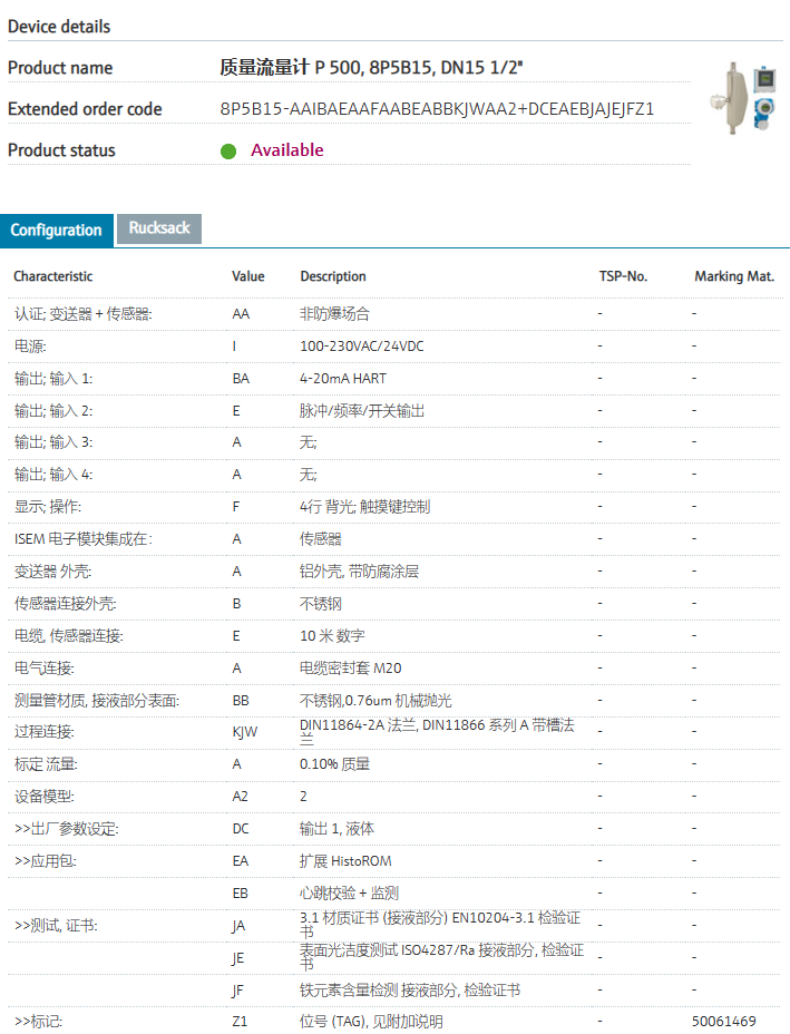 8P5B15-AAIBAEAAFAABEABBKJWAA2DCEAEBJAJEJFZ1 订货号 8P5B15-1LX8/0 扩展订货号 (8P5B15-AAIBAEAAFAABEABBKJWAA2+DCEAEBJAJEJFZ1) 名称 质量流量计 P 500, 8P5B15, DN15 1/2" 基本描述 Coriolis flowmeter