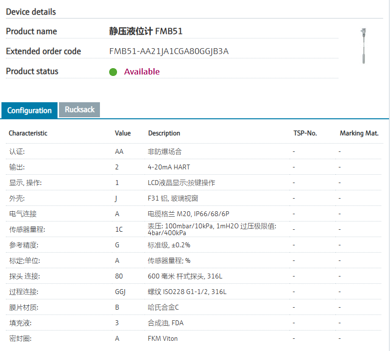 FMB51-AA21JA1CGA80GGJB3A 订货号 FMB51-2390/0 扩展订货号 (FMB51-AA21JA1CGA80GGJB3A) 名称 静压液位计 FMB51 基本描述 Measurement: Level, hydrostatic.