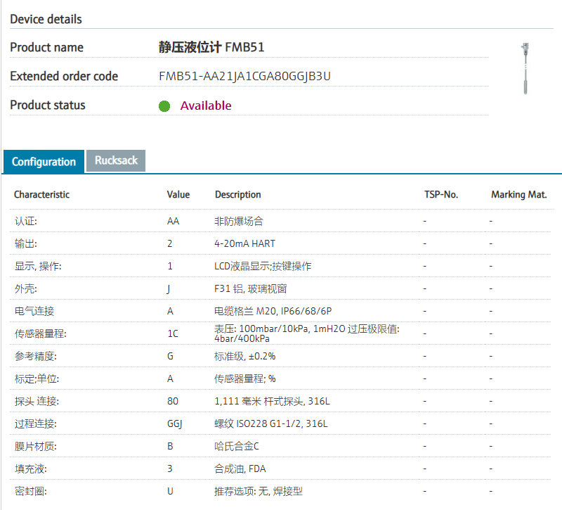 :: Modular.认证: AA 非防爆场合 输出: 2 4-20mA HART 显示, 操作: 1 LCD液晶显示;按键操作 外壳: J F31 铝, 玻璃视窗 电气连接: A 电缆格兰 M20, IP66/68/6P 传感器量程: 1C 表压: 100mbar/10kPa, 1mH2O 过压极限值: 4bar/400kPa 参考精度: G 标准级, ±0.2% 标定;单位: A 传感器量程; % 探头 连接: 80 ..... mm 杆式探头, 316L 过程连接: GGJ 螺纹 ISO228 G1-1/2, 316L 膜片材质: B 哈氏合金C 填充液: 3 合成油, FDA 密封圈: U 推荐选项: 无, 焊接型