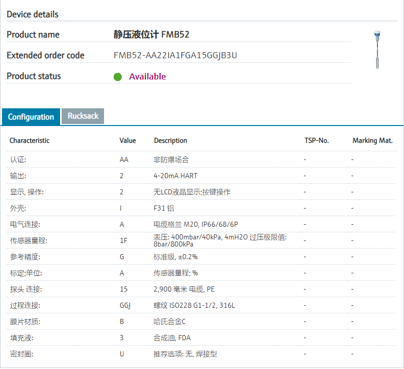 FMB52-AA22IA1FGA15GGJB3U 订货号 FMB52-CWU6/0 扩展订货号 (FMB52-AA22IA1FGA15GGJB3U) 名称 静压液位计 FMB52 基本描述 Measurement: Level, hydrostatic.