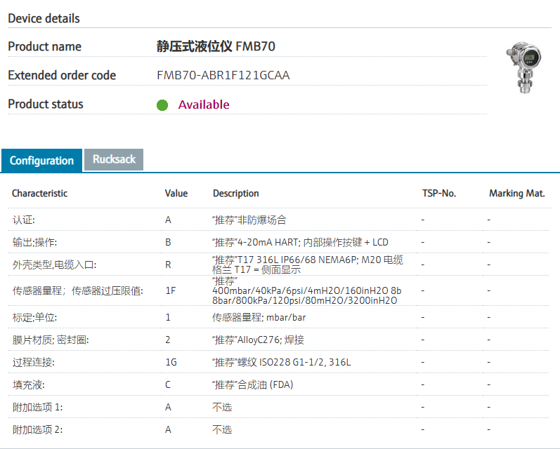 monitoring.认证: A “推荐”非防爆场合 输出;操作: B “推荐”4-20mA HART; 内部操作按键 + LCD 外壳类型,电缆入口: R “推荐”T17 316L IP66/68 NEMA6P; M20 电缆格兰 T17 = 侧面显示 传感器量程;传感器过压限值: 1F “推荐”400mbar/40kPa/6psi/4mH2O/160inH2O 8b 8bar/800kPa/120psi/80mH2O/3200inH2O 标定;单位: 1 传感器量程; mbar/bar 膜片材质; 密封圈: 2 “推荐”AlloyC276; 焊接 过程连接: 1G “推荐”螺纹 ISO228 G1-1/2, 316L 填充液: C “推荐”合成油 (FDA) 附加选项 1: A 不选 附加选项 2: A 不选