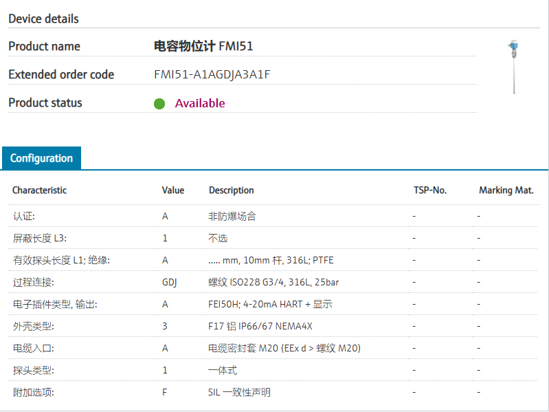 FMI51-A1AGDJA3A1F 扩展订货号 FMI51-A1AGDJA3A1F 名称 电容物位计 FMI51 基本描述 Level measurement, capacitance,