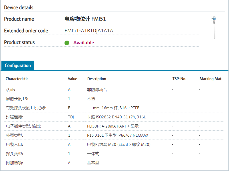 FMI51-A1BTDJA1A1A 扩展订货号 FMI51-A1BTDJA1A1A 名称 电容物位计 FMI51 基本描述 Level measurement, capacitance,