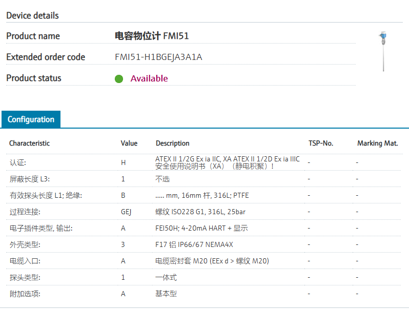 FMI51-H1BGEJA3A1A 扩展订货号 FMI51-H1BGEJA3A1A 名称 电容物位计 FMI51 基本描述 Level measurement, capacitance,