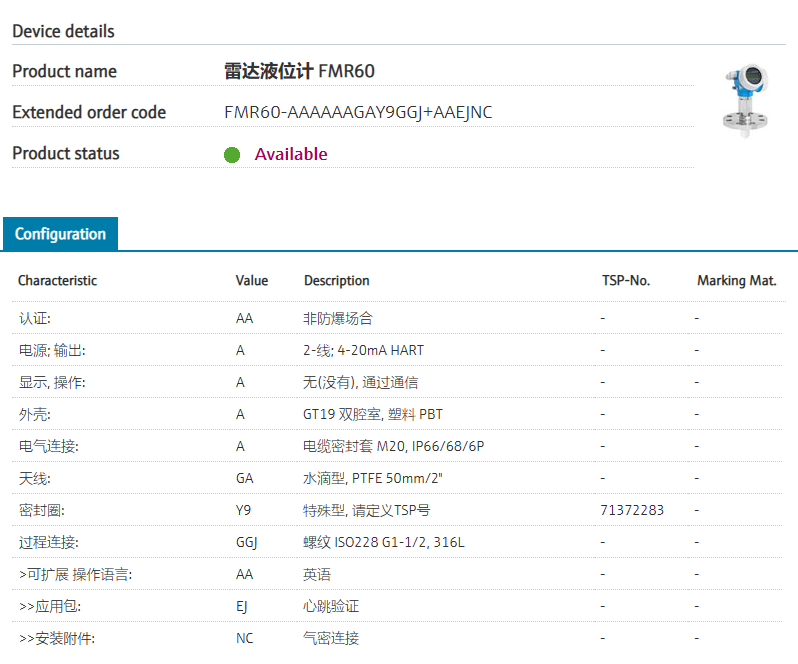 FMR60-AAAAAAGAY9GGJAAEJNC 订货号 FMR60-9WJ5/0 扩展订货号 (FMR60-AAAAAAGAY9GGJ+AAEJNC) 名称 **雷达液位计 FMR60 基本描述 "Product being phased out - Limited