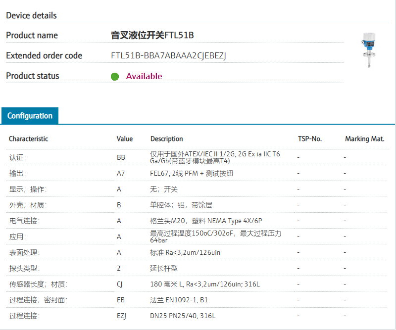 FTL51B-BBA7ABAAA2CJEBEZJ 订货号 FTL51B-2EDA2/0 扩展订货号 (FTL51B-BBA7ABAAA2CJEBEZJ ) 名称 音叉液位开关FTL51B 基本描述 Point level/density, vibronic.