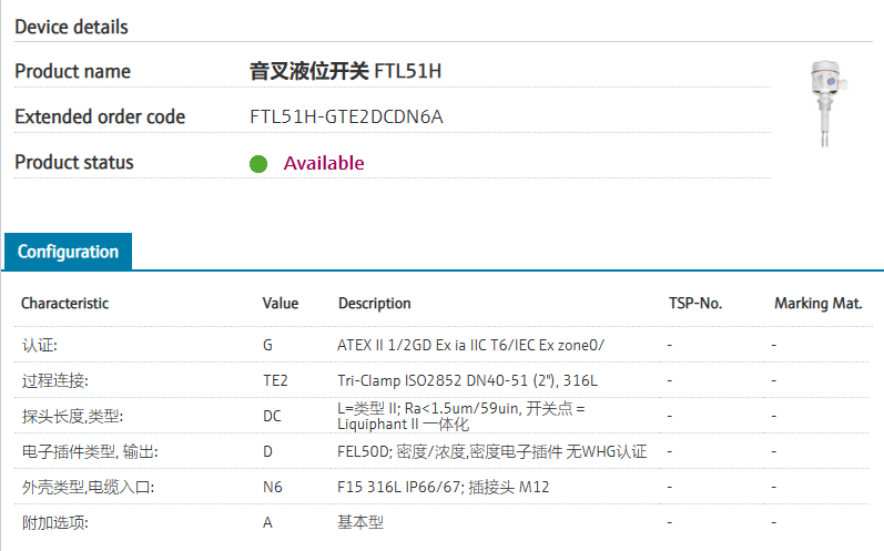 Liquiphant M FTL51H认证: G ATEX II 1/2GD Ex ia IIC T6/IEC Ex zone0/ 过程连接: TE2 Tri-Clamp ISO2852 DN40-51 (2"), 316L 探头长度,类型: DC L=类型 II; Ra<1.5um/59uin, 开关点=Liquiphant II 一体化 电子插件类型, 输出: D FEL50D; 密度/浓度,密度电子插件 无WHG认证 外壳类型,电缆入口: N6 F15 316L IP66/67; 插接头 M12 附加选项: A 基本型