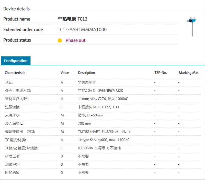 工业温度计,测量范围; -200...+600oC; 连接; G1 / 2 外 螺纹; 插入深度: 1,800 毫米,保护套管直径, 12x2.5mm; 延长段长度: 155 毫米,电缆入口: 1x M20x1.5 内螺纹,不防爆,