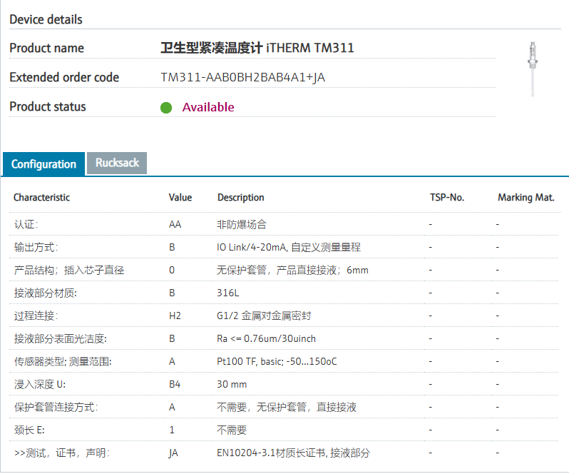 range of applications.认证: AA 非防爆场合 输出方式: B IO Link/4-20mA, 自定义测量量程 产品结构;插入芯子直径 0 无保护套管,产品直接接液;6mm 接液部分材质: B 316L 过程连接: H2 G1/2 金属对金属密封 接液部分表面光洁度: B Ra <= 0.76um/30uinch 传感器类型; 测量范围: A Pt100 TF, basic; -50...150oC 浸入深度 U: B4 30 mm 保护套管连接方式: A 不需要,无保护套管,直接接液 颈长 E: 1 不需要 >>测试,证书,声明: JA EN10204-3.1材质长证书, 接液部分