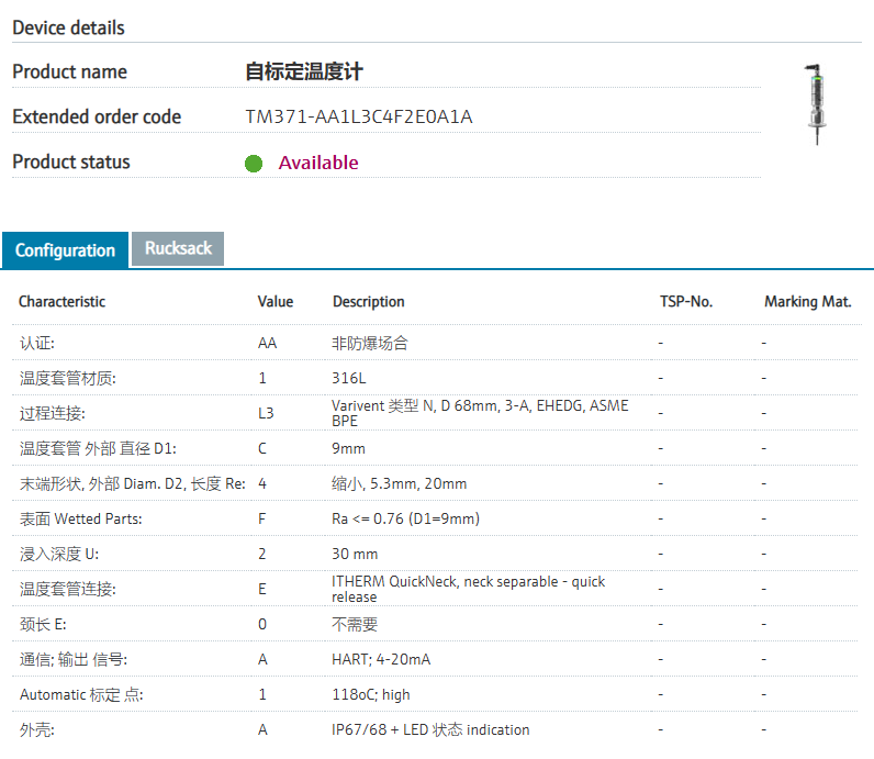 through Heartbeat monitoring.认证: AA 非防爆场合 温度套管材质: 1 316L 过程连接: L3 Varivent 类型 N, D 68mm, 3-A, EHEDG, ASME BPE 温度套管 外部 直径 D1: C 9mm 末端形状, 外部 Diam. D2, 长度 Re: 4 缩小, 5.3mm, 20mm 表面 Wetted Parts: F Ra <= 0.76 (D1=9mm) 浸入深度 U: 2 30 mm 温度套管连接: E ITHERM QuickNeck, neck separable - quick release 颈长 E: 0 不需要 通信; 输出 信号: A HART; 4-20mA Automatic 标定 点: 1 118oC; high 外壳: A IP67/68 + LED 状态 indication