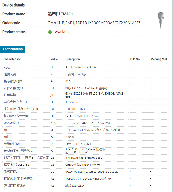 through iTHERM QuickNeck coupling.认证: BJ ATEX II1/2G Ex ia IIC T6 温度套管: 2 可拆卸过程连接 接液部分材质: A 316L 过程连接 类型: F1 螺纹 ISO228 (Liquiphant转接头) 过程连接: J1 G3/4 ISO228 适配FTL20, 3-A, EHEDG, ASME BPE 温度套管 外径 D1: D 12.7 mm 末端形状, 外径 D2, 长度 Re: B1 直的 (D1 = D2) 接液部分表面处理: D1 Ra <= 0.76 (D1=12.7 mm) 浸入深度 U: X30 ..... mm (70-4000, 9/12.7mm TW) 颈: Q1 iTHERM QuickNeck 延长径可分离 - 快速拆下 颈长 E: A0 不需要 绝缘段长度:T 00 预定义(不可更改) 传感器类型; 测量范围: A3 1xPT100 TF, QuickSens 快速响应;-50...+200oC 铠装芯子设计;直径 d,铠装材质: C2 4-wire MI-Cable; 6mm, 316L 精度 根据IEC60751: C2 Class AA (QuickSens, 6mm) 电气连接: 2C 4-20mA, TMT71, temp. range to be spec. 接线盒,材质,防护等级: A1 TA30A, 铝, IP66/68, NEMA 类型 4x 颈部连接 接线盒: A1 螺纹 M24x1.5 电缆入口 接线盒: A1 1x 螺纹 M20x1.5 >缆塞: C1 1x 聚酰胺; -40...+100oC; IP68