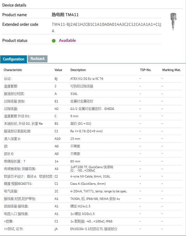 through iTHERM QuickNeck coupling.认证: BJ ATEX II1/2G Ex ia IIC T6 温度套管: 2 可拆卸过程连接 接液部分材质: A 316L 过程连接 类型: E1 金属对金属密封 过程连接: H2 G1/2 金属对金属密封,EHEDG 温度套管 外径 D1: C 9 mm 末端形状, 外径 D2, 长度 Re: B1 直的 (D1 = D2) 接液部分表面处理: C1 Ra <= 0.76 (D1=9 mm) 浸入深度 U: A10 25 mm 颈: A0 不需要 颈长 E: A0 不需要 绝缘段长度:T 14 85 mm 传感器类型; 测量范围: A3 1xPT100 TF, QuickSens 快速响应;-50...+200oC 铠装芯子设计;直径 d,铠装材质: C2 4-wire MI-Cable; 6mm, 316L 精度 根据IEC60751: C1 Class A (QuickSens, 6mm) 电气连接: 2C 4-20mA, TMT71, temp. range to be spec. 接线盒,材质,防护等级: A1 TA30A, 铝, IP66/68, NEMA 类型 4x 颈部连接 接线盒: A1 螺纹 M24x1.5 电缆入口 接线盒: A1 1x 螺纹 M20x1.5 >缆塞: C1 1x 聚酰胺; -40...+100oC; IP68