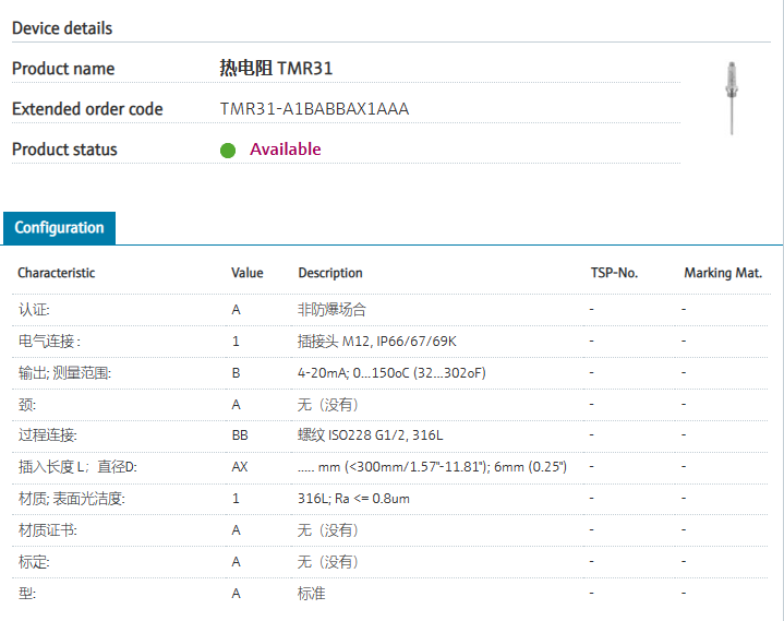 (最大插入深度300mm)认证: A 非防爆场合 电气连接 : 1 插接头 M12, IP66/67/69K 输出; 测量范围: B 4-20mA; 0...150oC (32...302oF) 颈: A 无(没有) 过程连接: BB 螺纹 ISO228 G1/2, 316L 插入长度 L;直径D: AX ..... mm (<300mm/1.57"-11.81"); 6mm (0.25") 材质; 表面光洁度: 1 316L; Ra <= 0.8um 材质证书: A 无(没有) 标定: A 无(没有) 型: A 标准