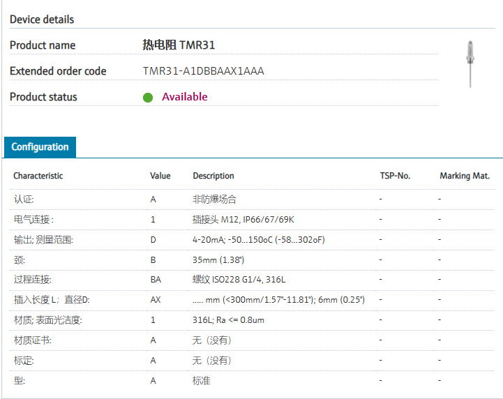 TMR31-A1DBBAAX1AAA 扩展订货号 TMR31-A1DBBAAX1AAA 名称 热电阻 TMR31 基本描述 传感器:Pt100,A级精度