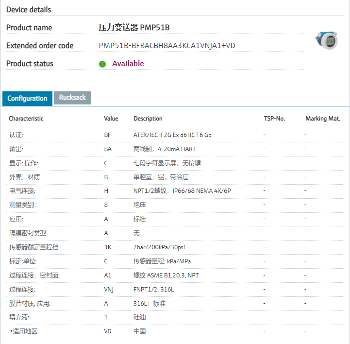 via Bluetooth (optional).认证: BF ATEX/IEC II 2G Ex db IIC T6 Gb 输出: BA “推荐”两线制,4-20mA HART 显示; 操作: C 七段字符显示屏,无按键 外壳;材质 B “推荐”单腔室;铝,带涂层 电气连接: H “推荐”NPT1/2螺纹,IP66/68 NEMA 4X/6P 测量类别: 8 绝压 应用: A “推荐”标准 隔膜密封类型 A “推荐”无 传感器额定量程档: 3K 推荐”2bar/200kPa/30psi 标定;单位: C “推荐”传感器量程; kPa/MPa 过程连接,密封面: A1 “推荐”螺纹 ASME B1.20.3, NPT 过程连接: VNJ “推荐”FNPT1/2, 316L 膜片材质; 应用: A “推荐”316L;标准 填充液: 1 “推荐”硅油 >适用地区: VD 中国