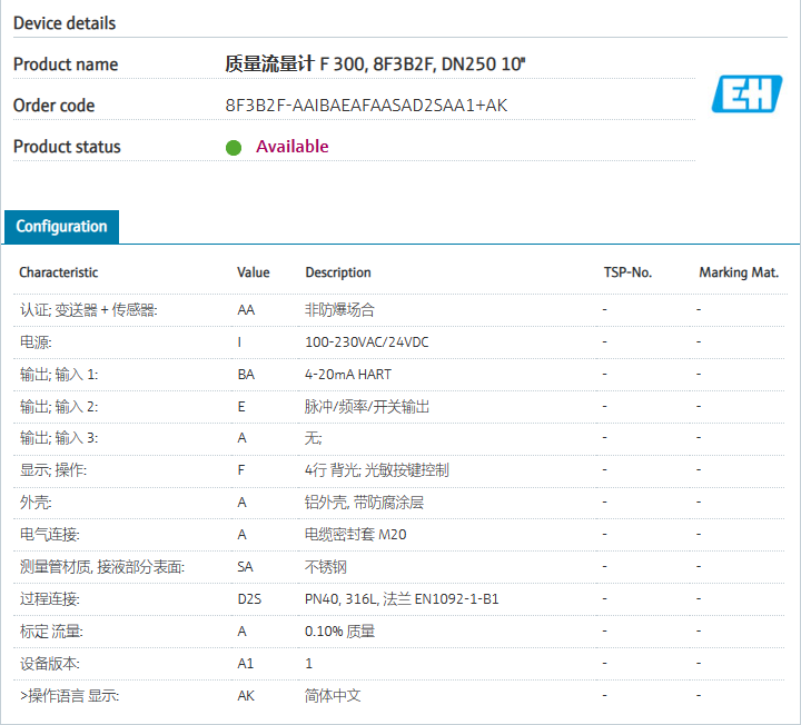 compact, easily accessible transmitter.认证; 变送器 + 传感器: AA 非防爆场合 电源: I 100-230VAC/24VDC 输出; 输入 1: BA 4-20mA HART 输出; 输入 2: E 脉冲/频率/开关输出 输出; 输入 3: A 无; 显示; 操作: F 4行 背光; 光敏按键控制 外壳: A 铝外壳, 带防腐涂层 电气连接: A 电缆密封套 M20 测量管材质, 接液部分表面: SA 不锈钢 过程连接: D2S PN40, 316L, 法兰 EN1092-1-B1 标定 流量: A 0.10% 质量 设备版本: A1 1 >操作语言 显示: AK 简体中文