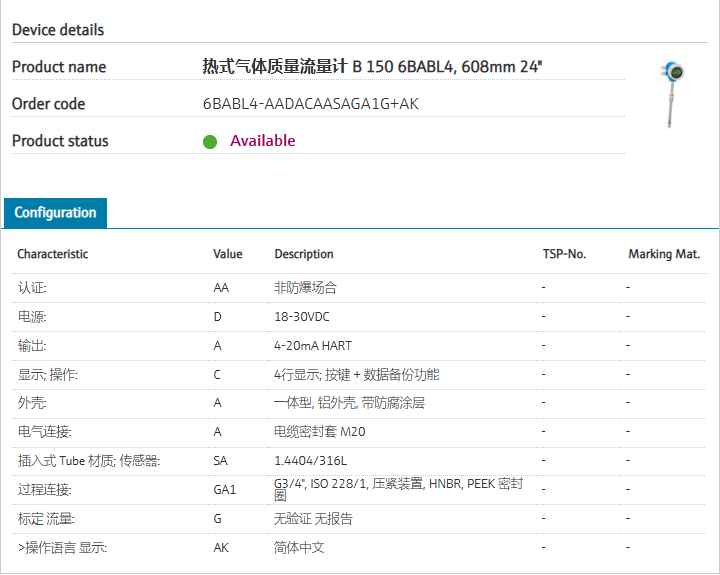 liquids.防爆认证: AA 非防爆场合 电源: D 18-30VDC 输出; 输入: A 4-20mA HART 显示; 操作: C 4行显示; 按键 + 数据备份功能 外壳: A 一体型, 铝外壳, 带防腐涂层 电气连接: A 电缆密封套 M20 插入式 管材质; 传感器: SA 不锈钢 过程连接: GA1 G3/4", 压紧装置, 密封垫圈HNBR, PEEK套管 ISO 228/1 标定 流量: G 无校验报告 >操作语言 显示: AK 简体中文