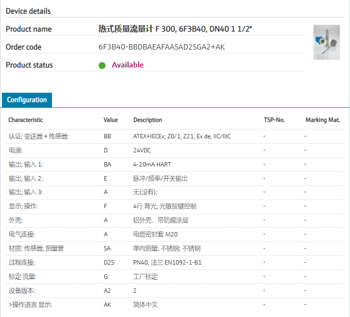 based on 21 standard gases or mixtures.认证; 变送器 + 传感器: BB ATEX+IECEx; Z0/1, Z21, Ex de, IIC/IIIC 电源: D 24VDC 输出; 输入 1: BA 4-20mA HART 输出; 输入 2: E 脉冲/频率/开关输出 输出; 输入 3: A 无(没有); 显示; 操作: F 4行 背光; 光敏按键控制 外壳: A 铝外壳,带防腐涂层 电气连接: A 电缆密封套 M20 材质: 传感器; 测量管 SA 单向测量; 不锈钢; 不锈钢 过程连接: D2S PN40, 法兰 EN1092-1-B1 标定 流量: G 工厂标定 设备版本: A2 2 >操作语言 显示: AK 简体中文