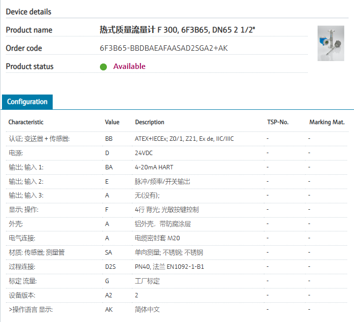 based on 21 standard gases or mixtures.认证; 变送器 + 传感器: BB ATEX+IECEx; Z0/1, Z21, Ex de, IIC/IIIC 电源: D 24VDC 输出; 输入 1: BA 4-20mA HART 输出; 输入 2: E 脉冲/频率/开关输出 输出; 输入 3: A 无(没有); 显示; 操作: F 4行 背光; 光敏按键控制 外壳: A 铝外壳,带防腐涂层 电气连接: A 电缆密封套 M20 材质: 传感器; 测量管 SA 单向测量; 不锈钢; 不锈钢 过程连接: D2S PN40, 法兰 EN1092-1-B1 标定 流量: G 工厂标定 设备版本: A2 2 >操作语言 显示: AK 简体中文