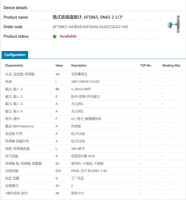 based on 21 standard gases or mixtures.认证; 变送器; 传感器: AA 非防爆场合 电源: I 100-230VAC/24VDC 输出; 输入 1: BA 4-20mA HART 输出; 输入 2: E 脉冲/频率/开关输出 输出; 输入 3: A 无(没有); 输出; 输入 4: A 无(没有); 显示; 操作: F 4行 背光; 触摸键控制 集成 ISEM Electronic: A 传感器 变送器 外壳: A 铝,外涂层 传感器 连接外壳: A 铝,外涂层 电缆, 传感器连接: L 10m 数字 电气连接: A 电缆密封套 M20 传感器 型; 传感器; 测量管: SA 单向的; 不锈钢; 不锈钢 过程连接: D2S PN40, 法兰 EN1092-1-B1 标定 流量: G 工厂标定 设备模式: A2 2 >操作语言 显示: AK 简体中文