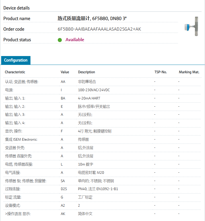 based on 21 standard gases or mixtures.认证; 变送器; 传感器: AA 非防爆场合 电源: I 100-230VAC/24VDC 输出; 输入 1: BA 4-20mA HART 输出; 输入 2: E 脉冲/频率/开关输出 输出; 输入 3: A 无(没有); 输出; 输入 4: A 无(没有); 显示; 操作: F 4行 背光; 触摸键控制 集成 ISEM Electronic: A 传感器 变送器 外壳: A 铝,外涂层 传感器 连接外壳: A 铝,外涂层 电缆, 传感器连接: L 10m 数字 电气连接: A 电缆密封套 M20 传感器 型; 传感器; 测量管: SA 单向的; 不锈钢; 不锈钢 过程连接: D2S PN40, 法兰 EN1092-1-B1 标定 流量: G 工厂标定 设备模式: A2 2 >操作语言 显示: AK 简体中文