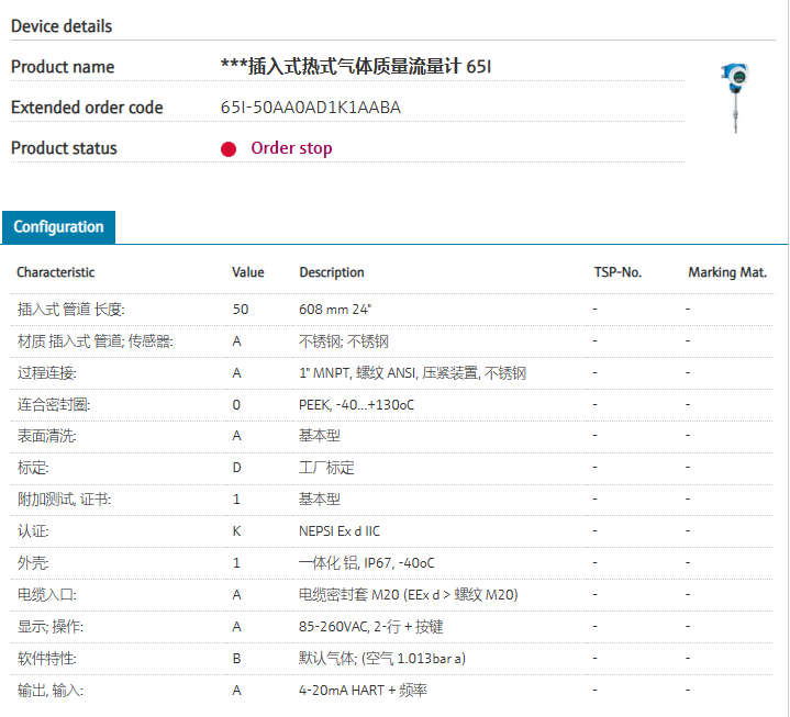 65I-50AA0AD1K1AABA 扩展订货号 65I-50AA0AD1K1AABA 名称 ***插入式热式气体质量流量计 65I 基本描述 Thermal mass flowmeter for gases.