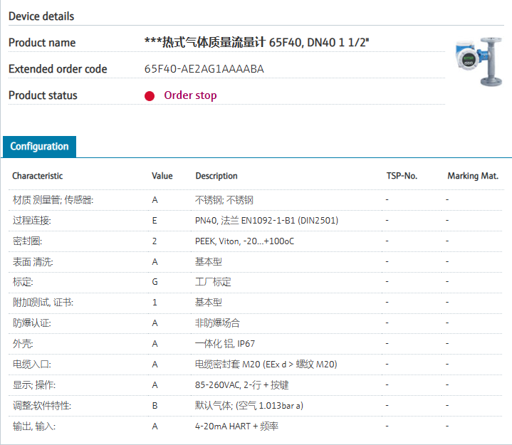 Flange type材质 测量管; 传感器: A 不锈钢; 不锈钢 过程连接: E PN40, 法兰 EN1092-1-B1 (DIN2501) 密封圈: 2 PEEK, Viton, -20...+100oC 表面 清洗: A 基本型 标定: G 工厂标定 附加测试, 证书: 1 基本型 防爆认证: A 非防爆场合 外壳: A 一体化 铝, IP67 电缆入口: A 电缆密封套 M20 (EEx d > 螺纹 M20) 显示; 操作: A 85-260VAC, 2-行 + 按键 调整;软件特性: B 默认气体; (空气 1.013bar a)