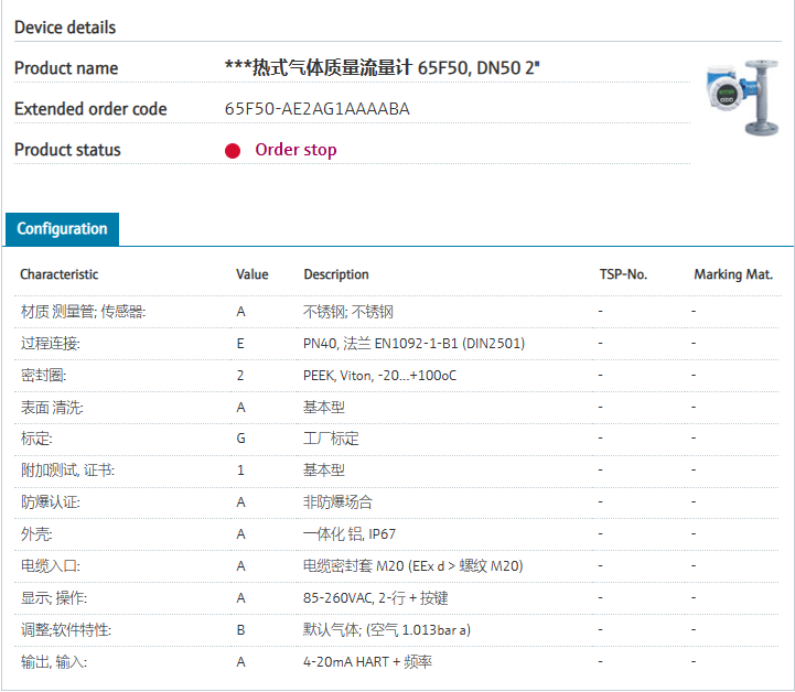 Flange type材质 测量管; 传感器: A 不锈钢; 不锈钢 过程连接: E PN40, 法兰 EN1092-1-B1 (DIN2501) 密封圈: 2 PEEK, Viton, -20...+100oC 表面 清洗: A 基本型 标定: G 工厂标定 附加测试, 证书: 1 基本型 防爆认证: A 非防爆场合 外壳: A 一体化 铝, IP67 电缆入口: A 电缆密封套 M20 (EEx d > 螺纹 M20) 显示; 操作: A 85-260VAC, 2-行 + 按键 调整;软件特性: B 默认气体; (空气 1.013bar a)