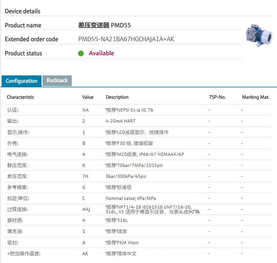 :: Modular.认证: NA "推荐"NEPSI Ex ia IIC T6 输出: 2 4-20mA HART 显示,操作: 1 "推荐"LCD液晶显示,按键操作 外壳: B "推荐"F30 铝, 玻璃视窗 电气连接: A "推荐"M20缆塞, IP66/67 NEMA4X/6P 静压范围: 6 "推荐"70bar/7MPa/1015psi 差压范围: 7H 3bar/300kPa/45psi 参考精度: G "推荐"标准级 标定;单位: C Nominal value; kPa/MPa 过程连接: HAJ "推荐"NPT1/4-18 IEC61518 UNF7/16-20, 316L, V1 适用于垂直引压管,与表头成90°角 膜材质: A "推荐"316L 填充液: 1 "推荐"硅油 密封: A "推荐"FKM Viton >附加操作语言: AK "推荐"简体中文