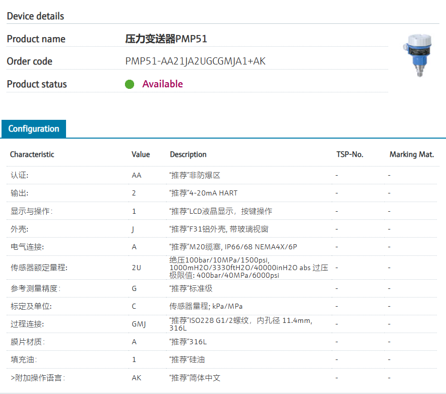 :: Modular.认证: AA “推荐”非防爆区 输出: 2 “推荐”4-20mA HART 显示与操作: 1 “推荐”LCD液晶显示,按键操作 外壳: J “推荐”F31铝外壳, 带玻璃视窗 电气连接: A 推荐”M20缆塞, IP66/68 NEMA4X/6P 传感器额定量程: 2U 绝压100bar/10MPa/1500psi, 1000mH2O/3330ftH2O/40000inH2O abs 过压极限值 参考测量精度: G “推荐”标准级 标定及单位: C 传感器量程; kPa/MPa 过程连接: GMJ “推荐”ISO228 G1/2螺纹,内孔径 11.4mm, 316L 膜片材质: A “推荐”316L 填充油: 1 “推荐”硅油 >附加操作语言: AK “推荐”简体中文