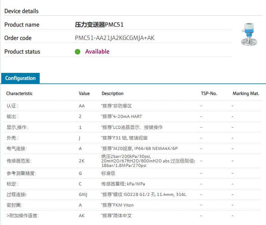 :: Modular.认证: AA “推荐”非防爆区 输出: 2 “推荐”4-20mA HART 显示,操作: 1 “推荐”LCD液晶显示,按键操作 外壳: J “推荐”F31 铝, 玻璃视窗 电气连接: A “推荐”M20缆塞, IP66/68 NEMA4X/6P 传感器范围: 2K 绝压2bar/200kPa/30psi, 20mH2O/67ftH2O/800inH2O abs 过压极限值: 18bar/1.8MPa/270psi 参考测量精度: G 标准级 标定: C 传感器量程; kPa/MPa 过程连接: GMJ “推荐”螺纹 ISO228 G1/2 孔 11.4mm, 316L 密封圈: A “推荐”FKM Viton >附加操作语言: AK “推荐”简体中文